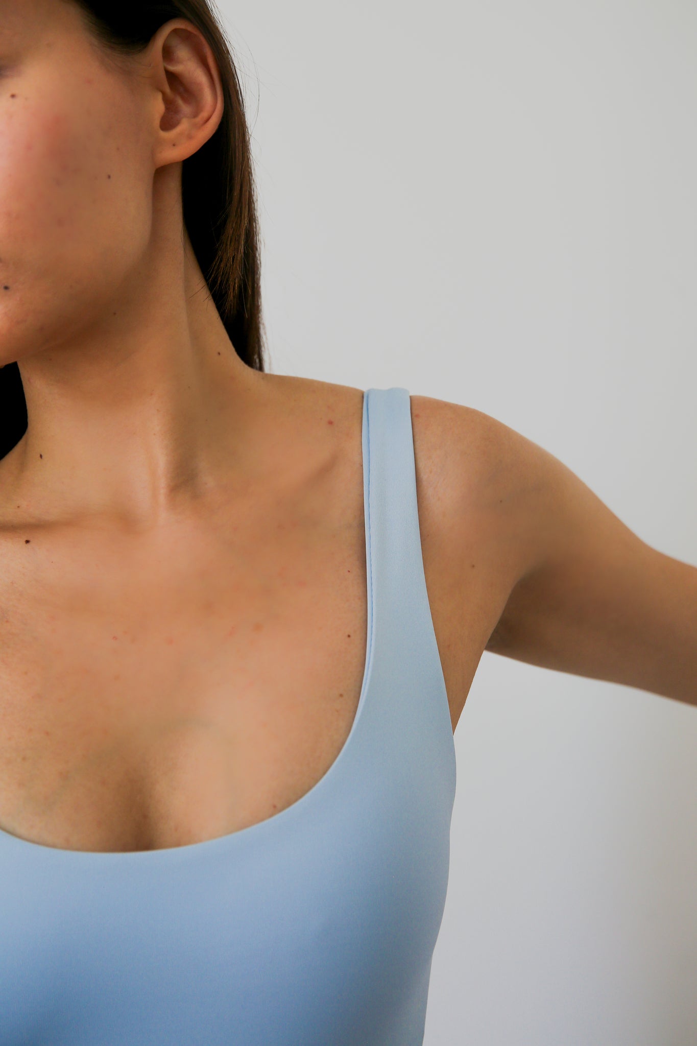 Carola is a versatile piece that transitions seamlessly from swimwear to a sleek bodysuit, crafted from the same recycled polyamide and elastane blend as our turtlenecks. This sky blue design is both soft and supportive, handmade by skilled tailors in Portugal.
