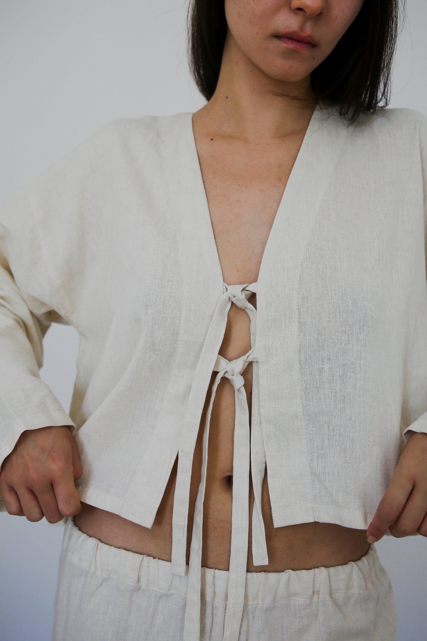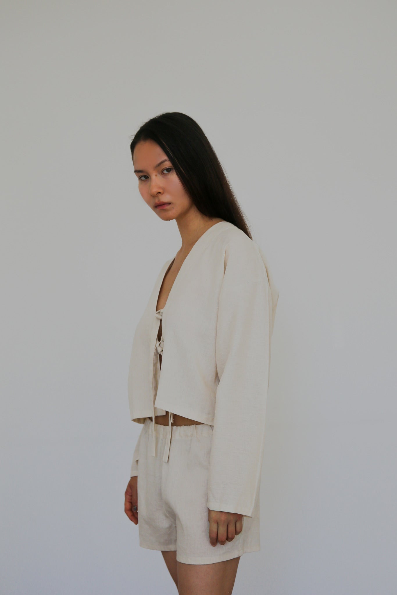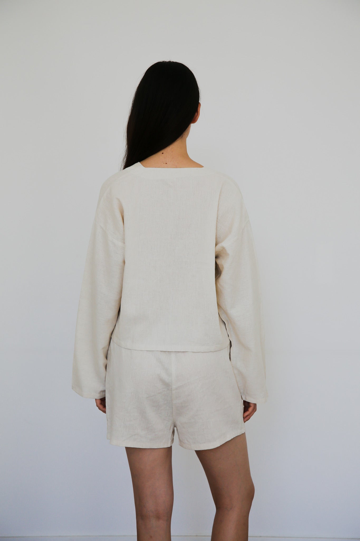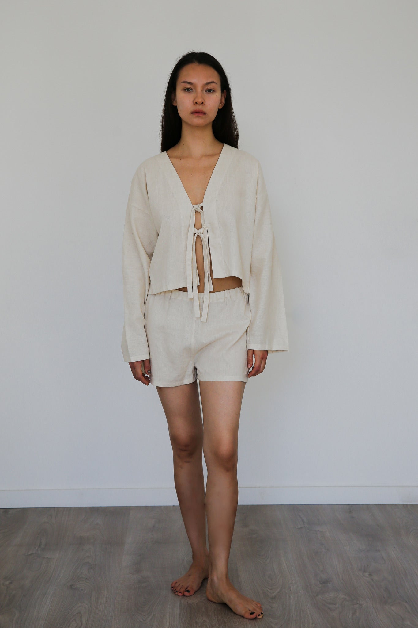 llaria is a relaxed fit set, crafted from 100% natural linen. Featuring a blouse with delicate front ties and elasticated shorts, this set combines effortless elegance with breathable comfort.