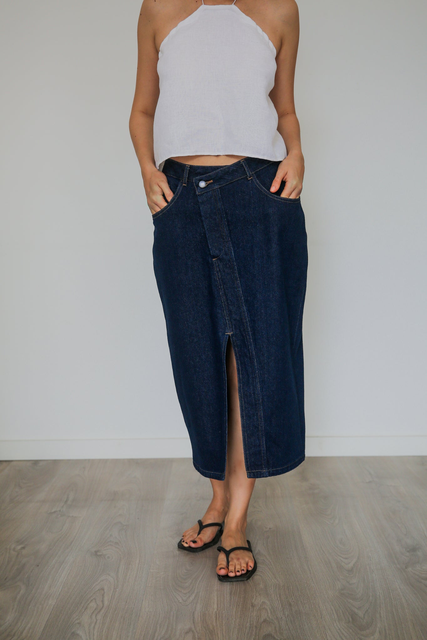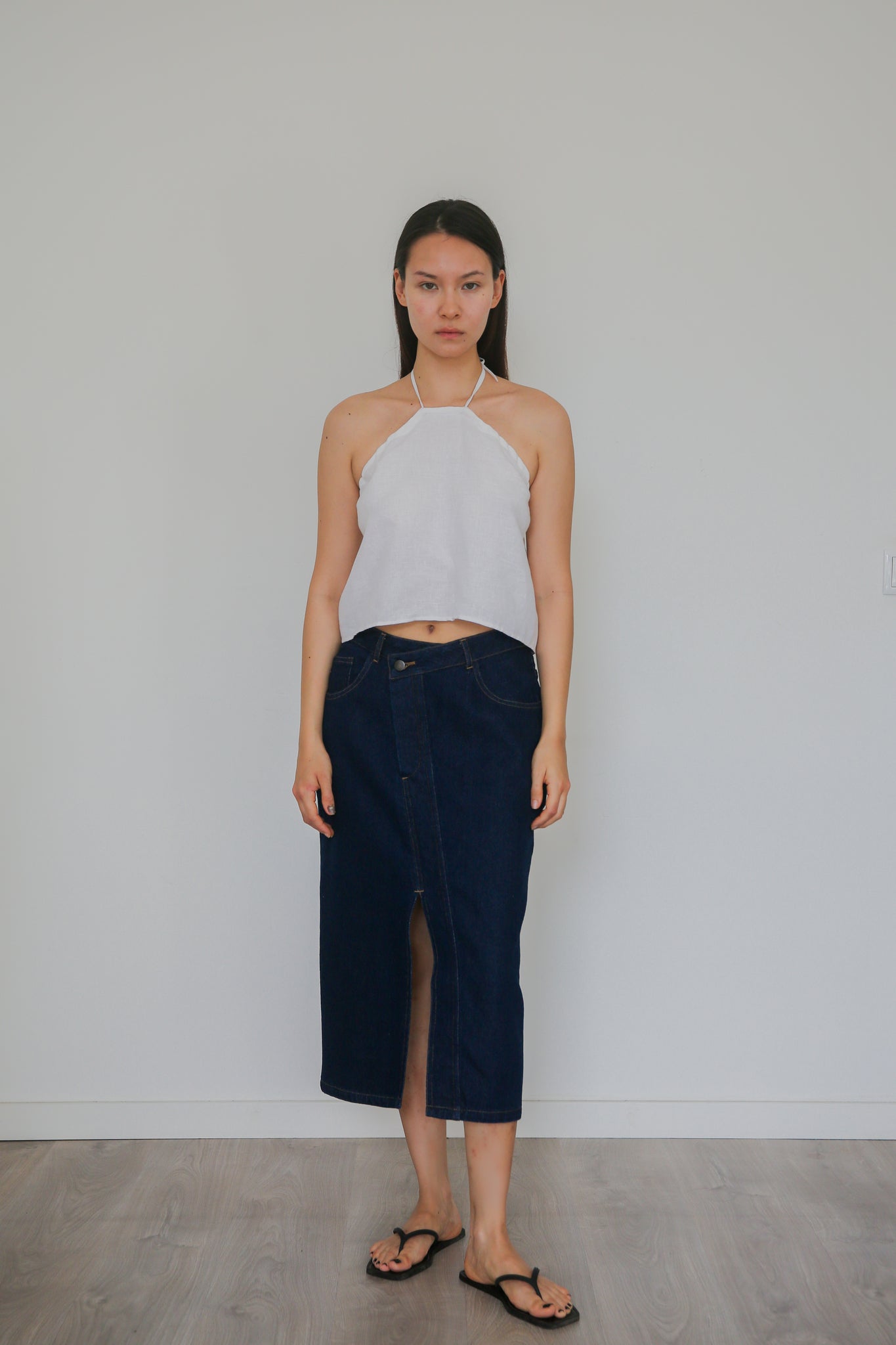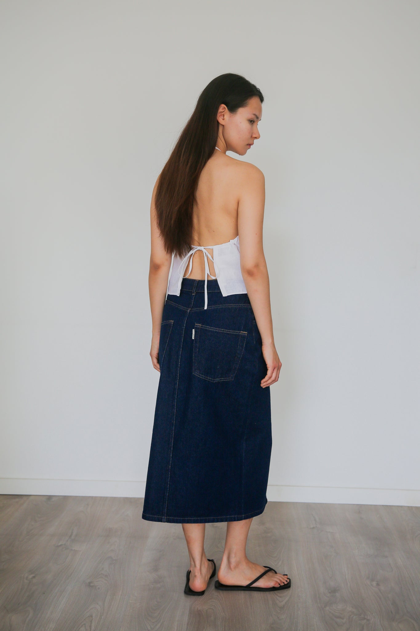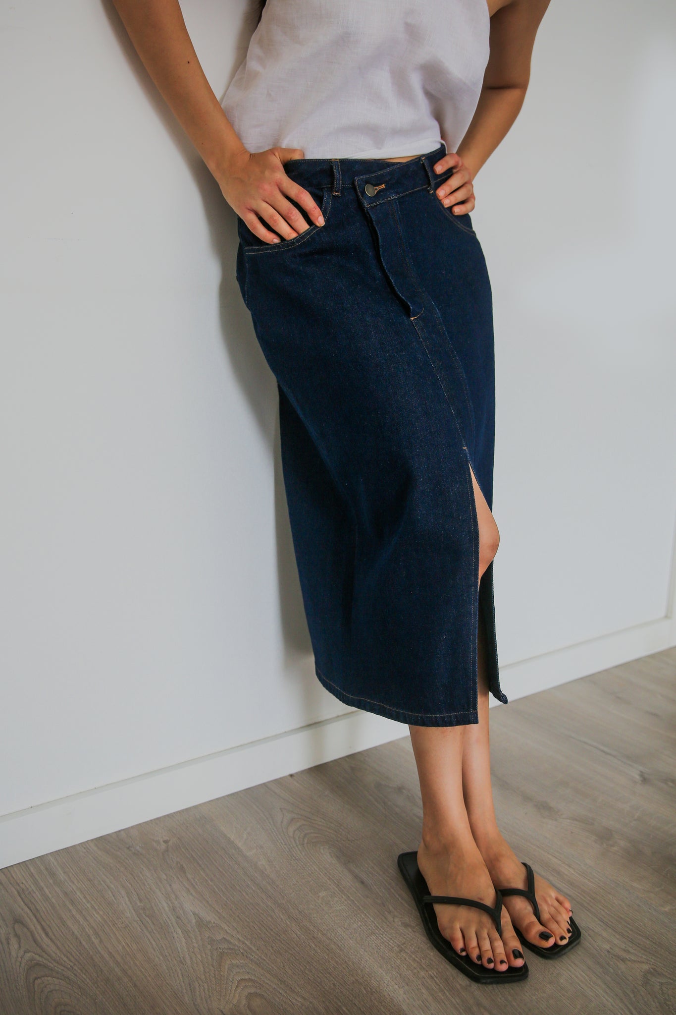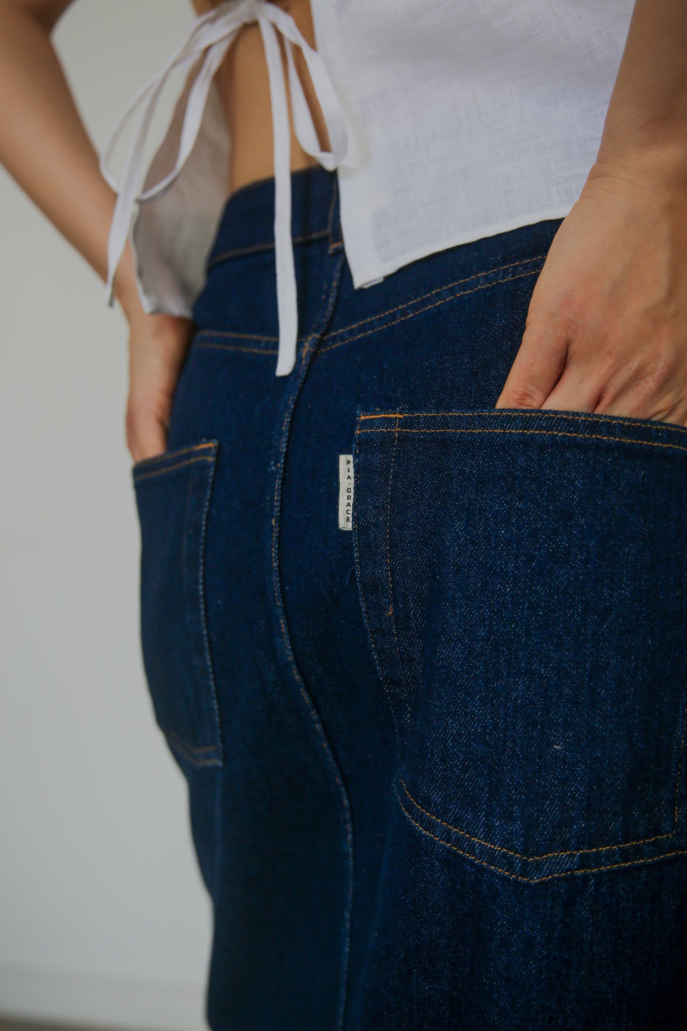 Nina is a relaxed fit, raw denim skirt made from certified recycled and organic materials, with a sloped zip adding a subtle, modern detail.
