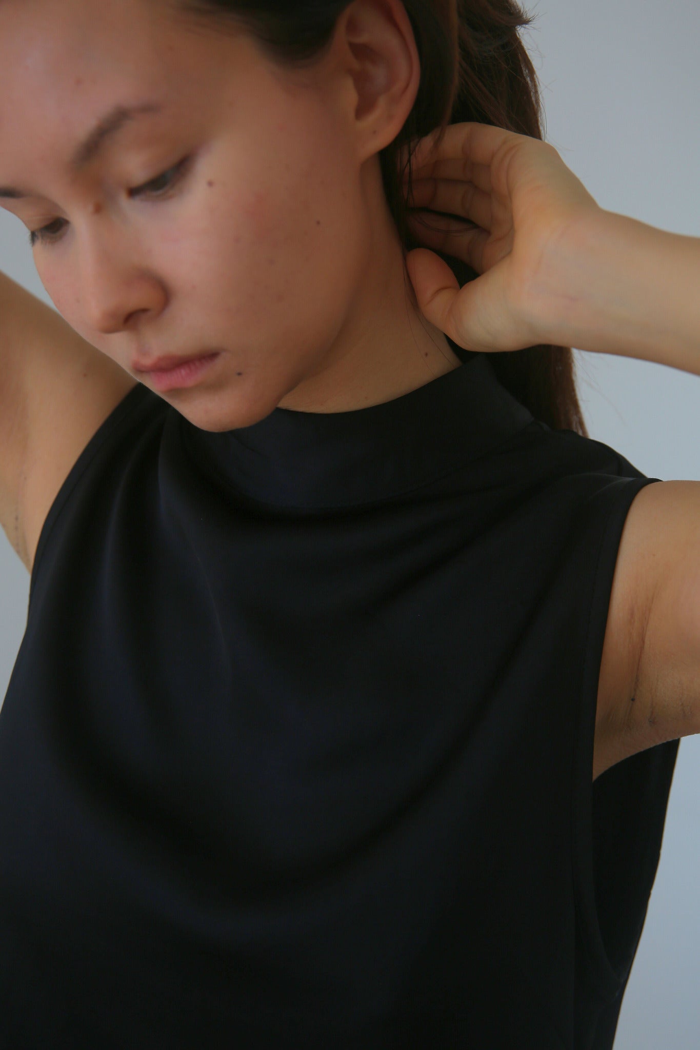 Pia is a chic and versatile, sleeveless high neck top. Crafted from the same luxurious recycled viscose satin as our trousers, offering a fluid drape and soft sheen.